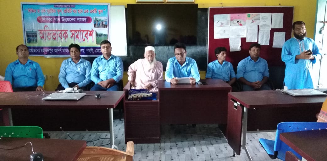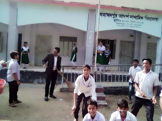 ছাত্র শিক্ষক মিলে একসাথে স্কুল এর আংগিনা পরিস্কার করছে.